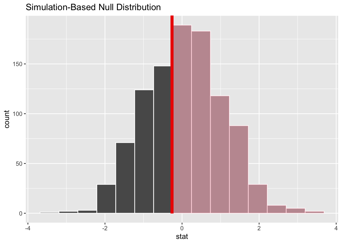 # here, we take the null distribution and test statistic we calculated above, use the "visualize" function, and then mark the part of the distribution that is as or more extreme than what we observed