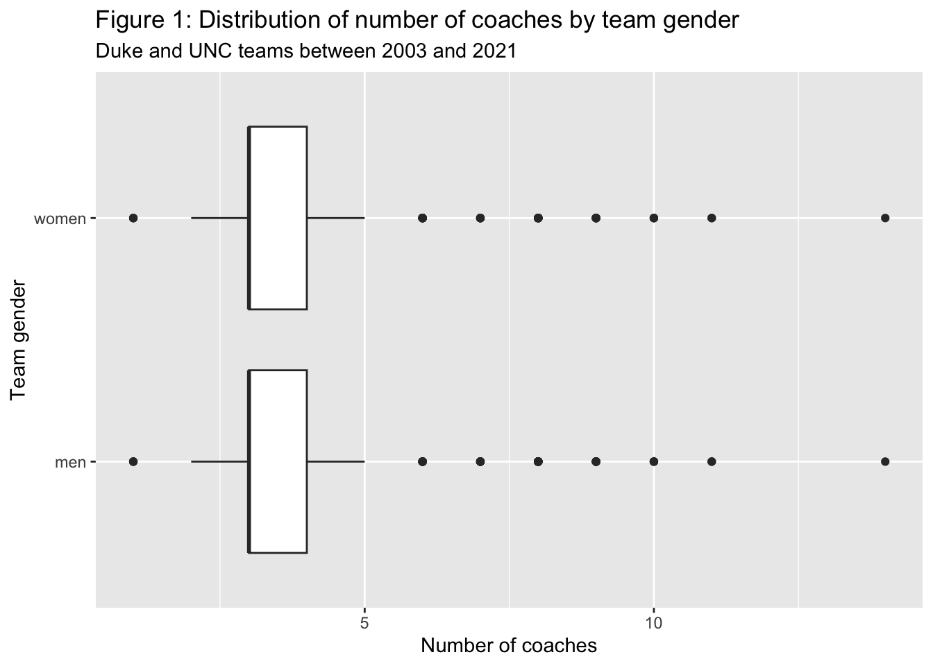 Figure 1 compares the distribution of number of coaches for men’s teams with that of women’s teams. If women’s teams are less well-staffed than men’s teams, we would see that the distribution for women’s teams would be positioned lower than that for men’s teams. However, there are no notable differences between genders detectable in this figure. The distributions for men and for women are both centered in the same place and have the same range and quartile divisions. If differences exist, they are very small and perhaps not very meaningful.