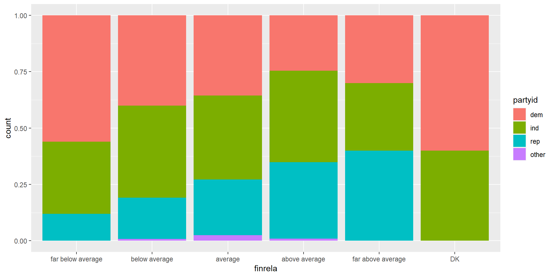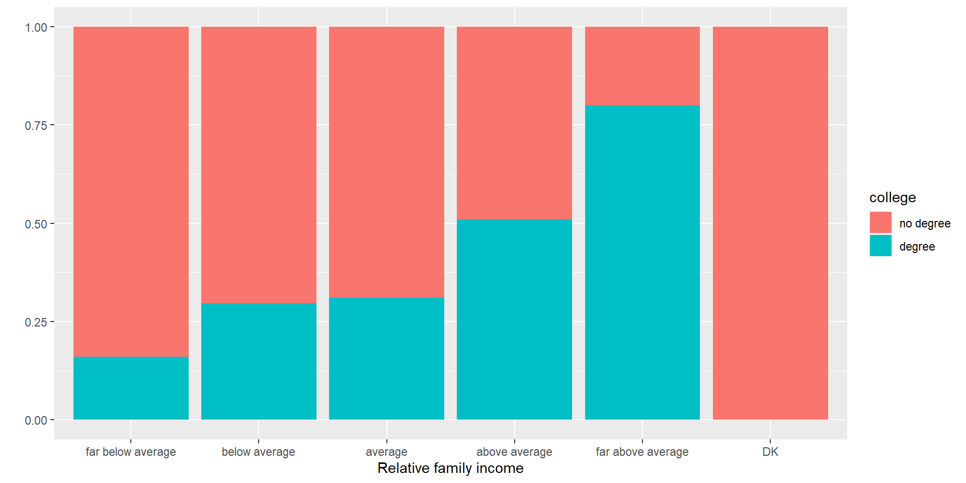 ggplot(gss, aes(x = finrela, fill = college)) +# the "position" argument here # is what is changinggeom_bar(position ="fill") +labs(x ="Relative family income",y ="")