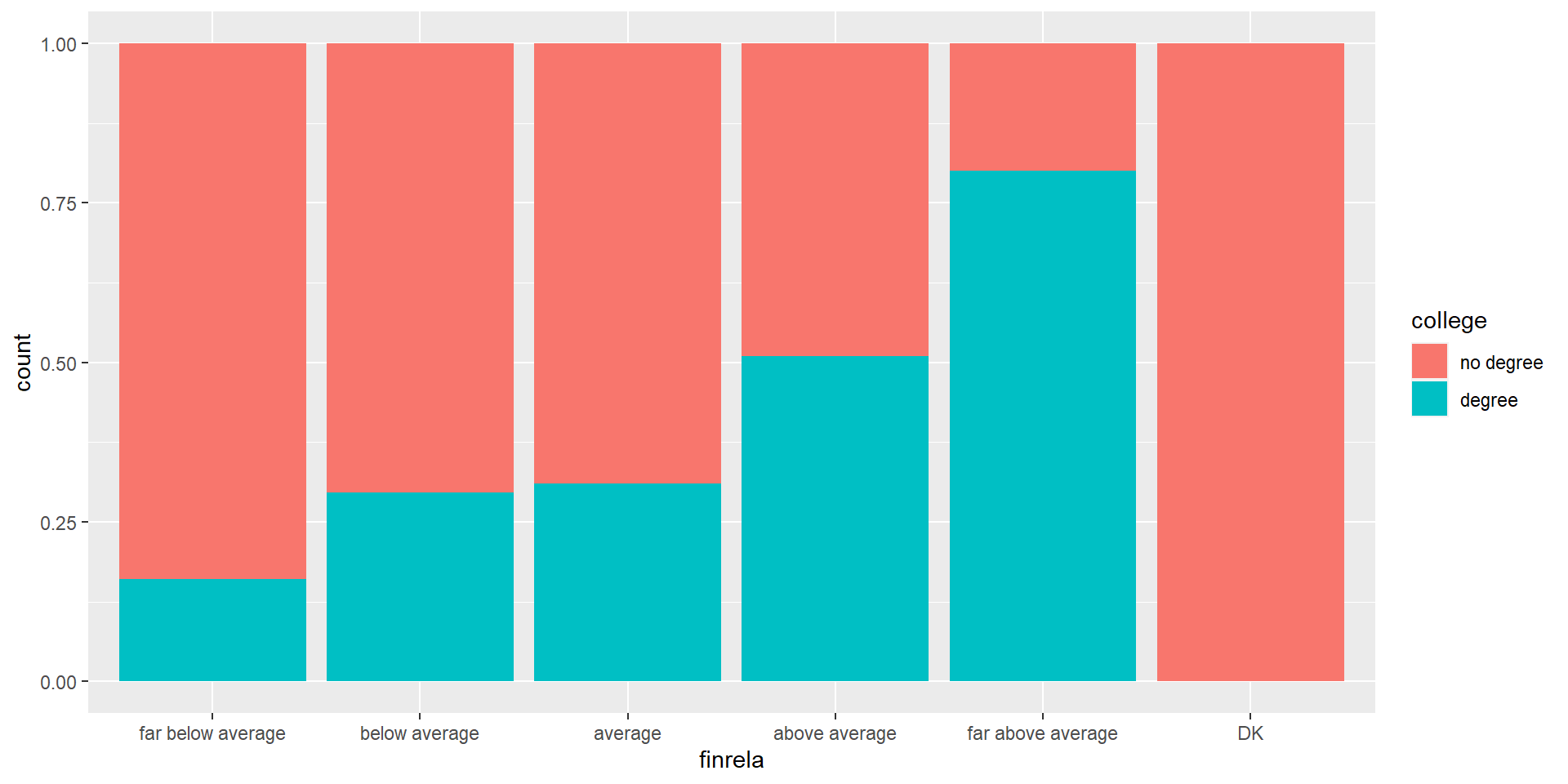 ggplot(gss, aes(x = finrela, fill = college)) +geom_bar(position ="fill")