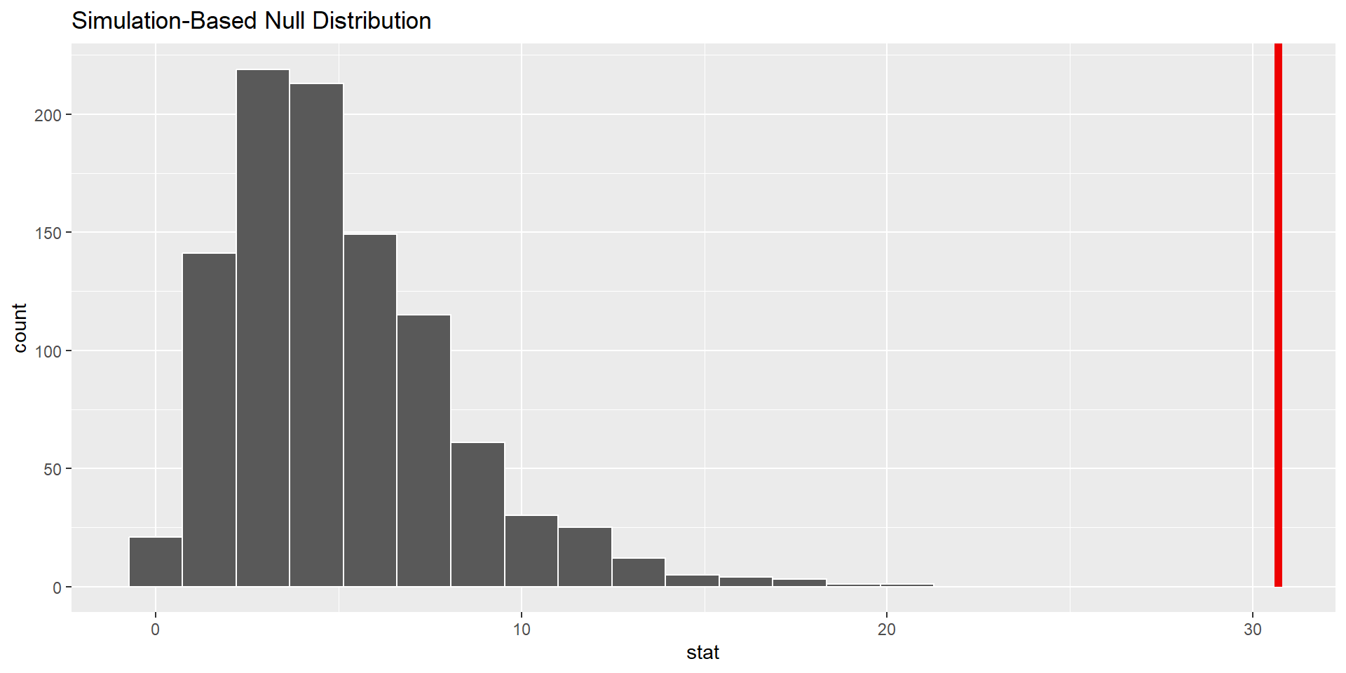 # 1. Calculate test statistictest_stat <- gss |>specify(explanatory = finrela,response = college) |>hypothesize(null ="independence") |>calculate(stat ="Chisq") # calculate the Chi square statistic# 2. Simulate null distributionnull_dist <- gss |>specify(explanatory = finrela,response = college) |>hypothesize(null ="independence") |>generate(reps =1000) |>calculate(stat ="Chisq")# 3. Use both to get the p valueget_p_value(null_dist,obs_stat = test_stat,direction ="greater") # we want the probability of a statistic larger than what we calculated