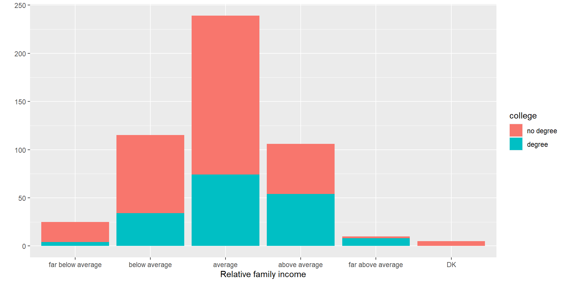 ggplot(gss, aes(x = finrela, fill = college)) +geom_bar() +labs(x ="Relative family income",y ="")