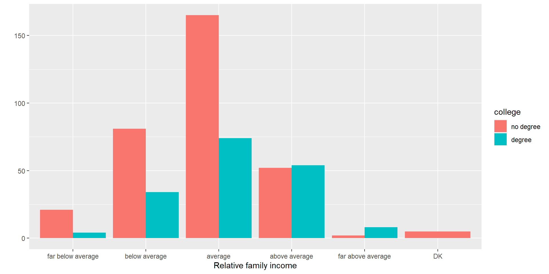 ggplot(gss, aes(x = finrela, fill = college)) +# the "position" argument here # is what is changinggeom_bar(position ="dodge") +labs(x ="Relative family income",y ="")