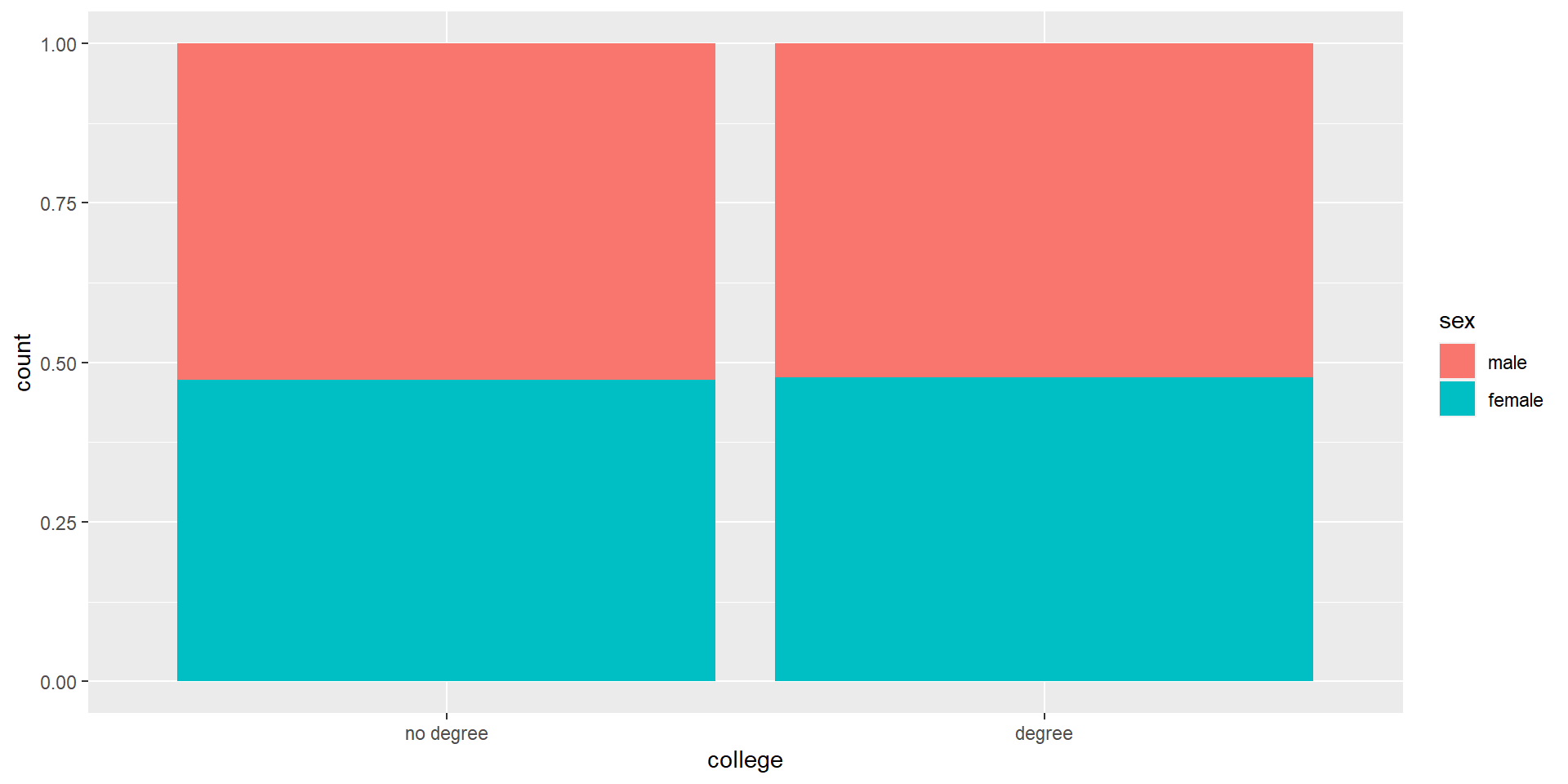 Dodged bar chart: Good at showing the distributions of the two groups next to each other. Now we can see that there are fewer people with degrees.