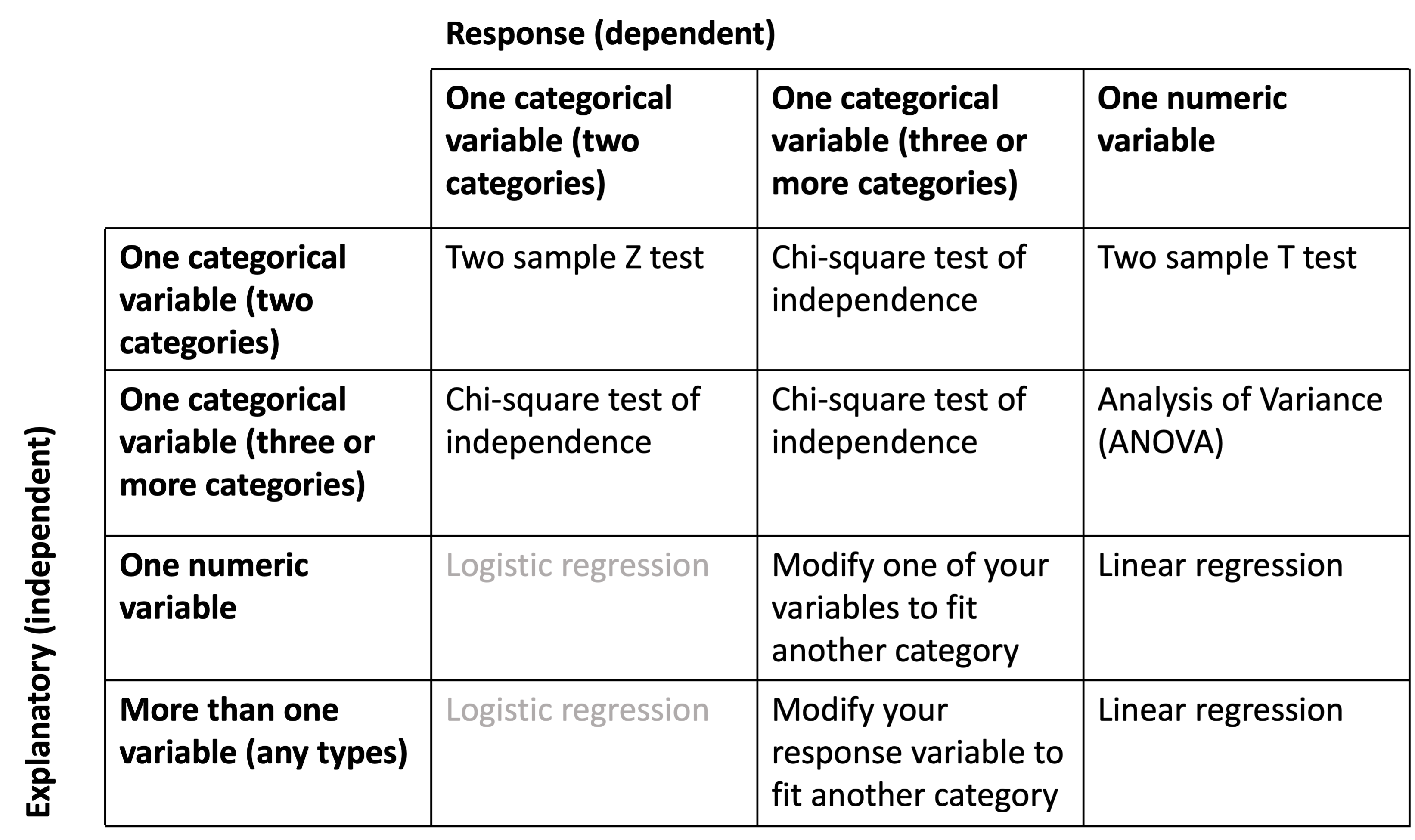 We’ll be covering 5 specific hypothesis tests (all except logistic regression)
