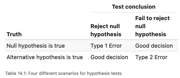 - If a type 1 error is dangerous/costly, we should choose a smaller signifance level (maybe p = 0.01)